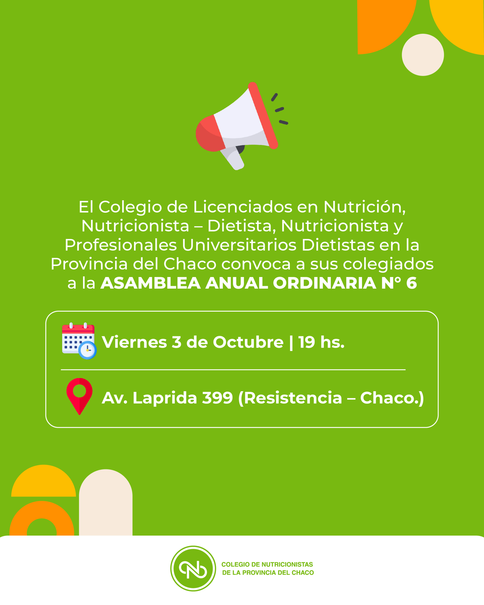 Desde el Colegio de Licenciados en Nutrición, Nutricionista – Dietista, Nutricionista y Profesionales Universitarios Dietistas en la Provincia del Chaco convocamos a todos nuestros colegiados a participar de la Asamblea Anual Ordinaria N° 6, que se realizará el próximo: